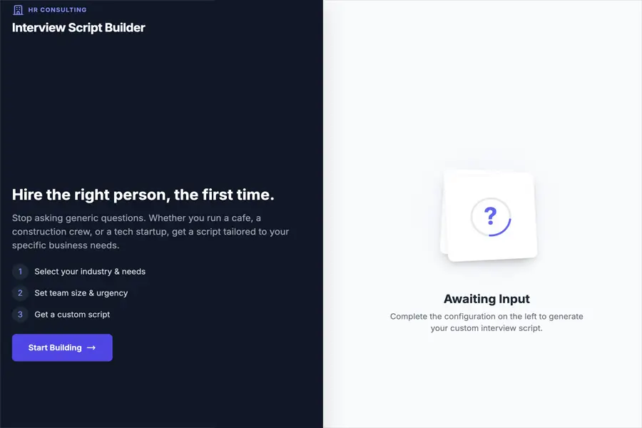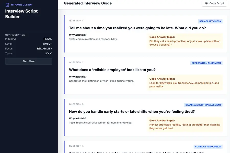 Create structured interview questions that help you hire better people faster. Reduces guesswork and helps you choose the right fit with confidence.